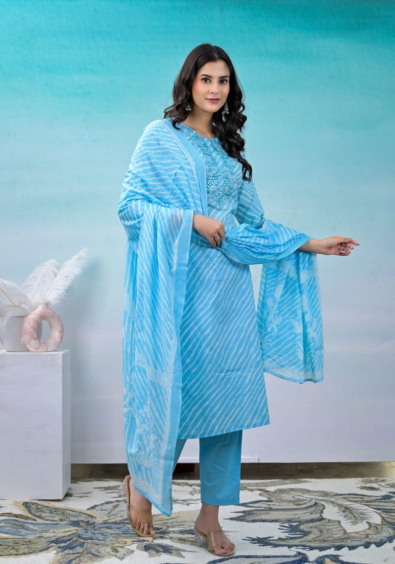 Blue Leheriya Print Mirror work Suit set