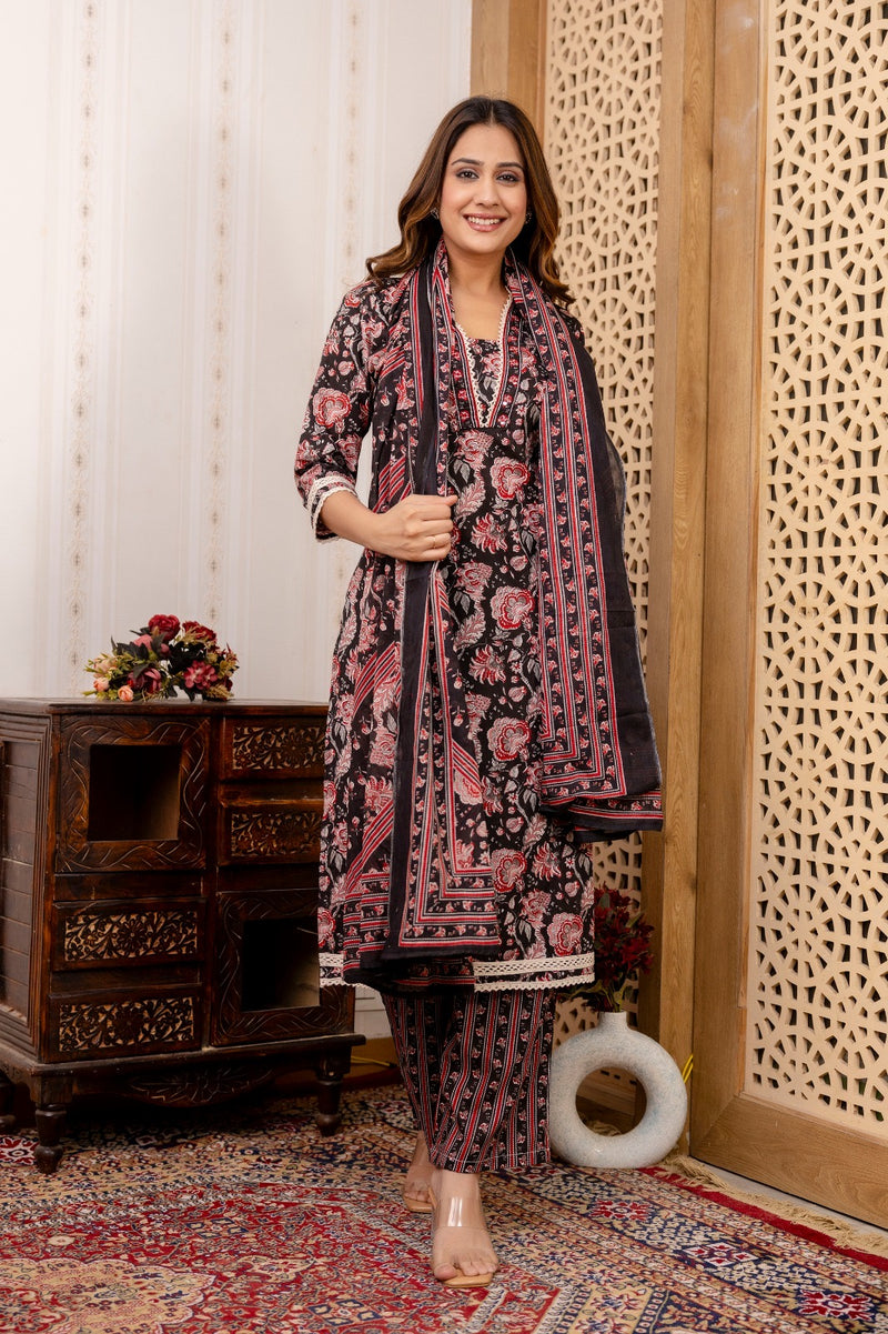 Black Floral Print Suit Set