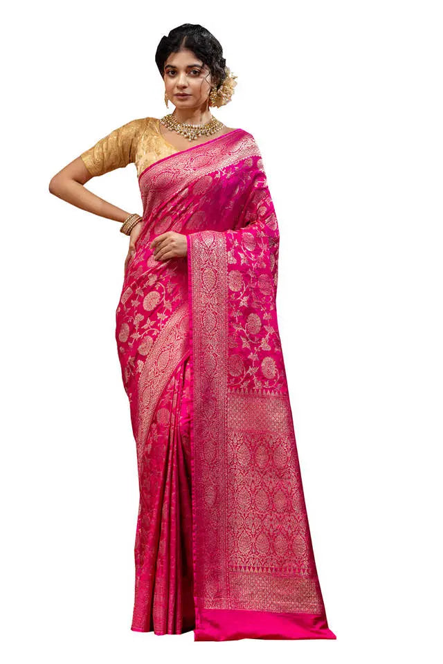 Rani Pink Kattan Silk Saree with Zari work and Blouse Piece