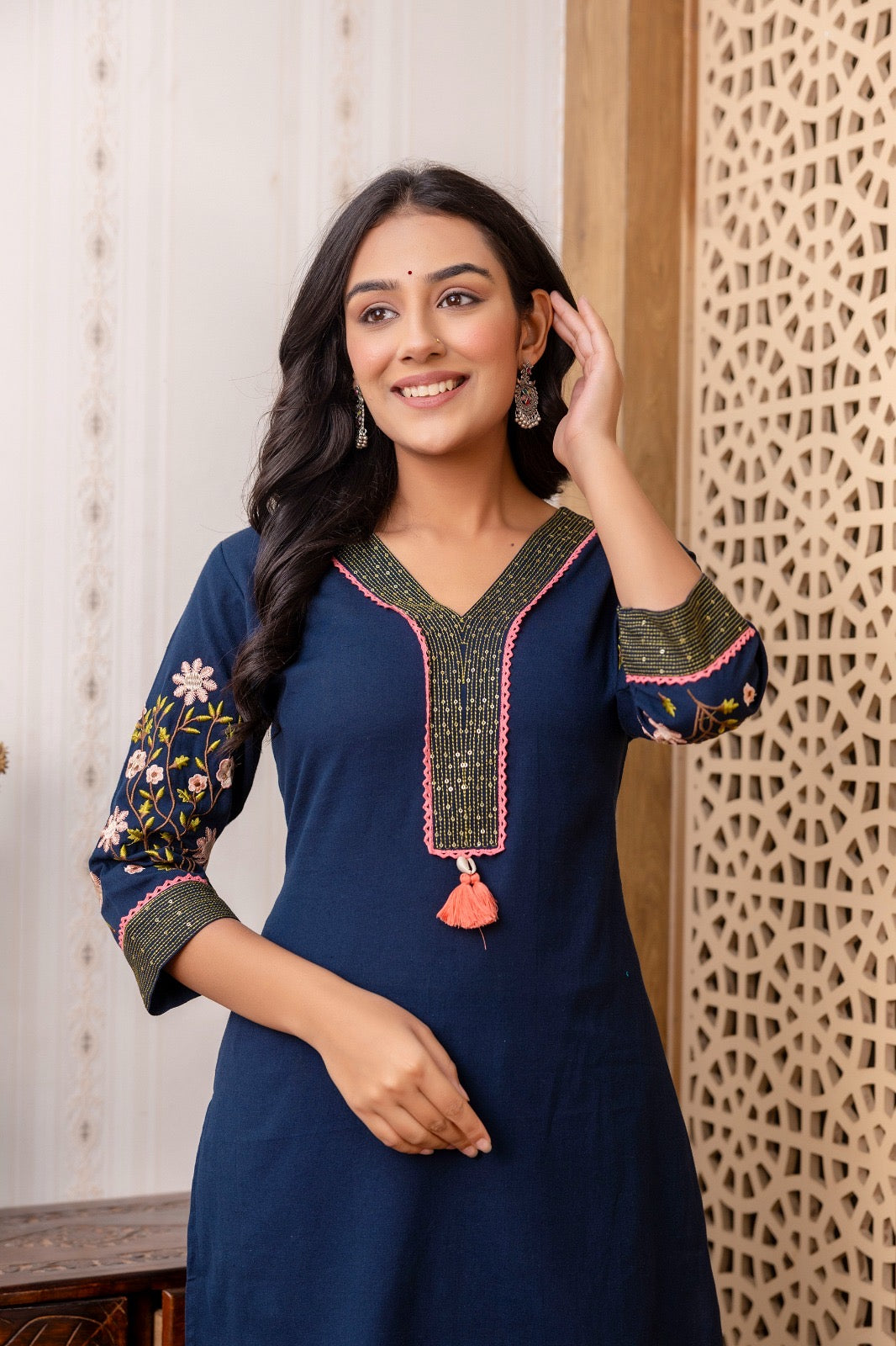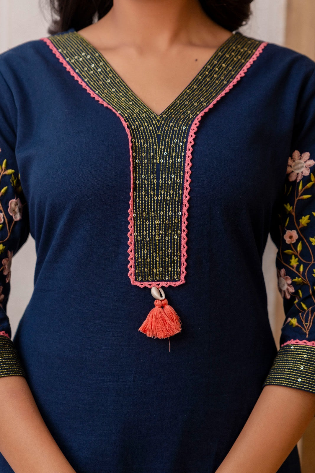 • The kurti has a V-neckline with contrasting pink piping and tassel detailing, providing a pop of color.