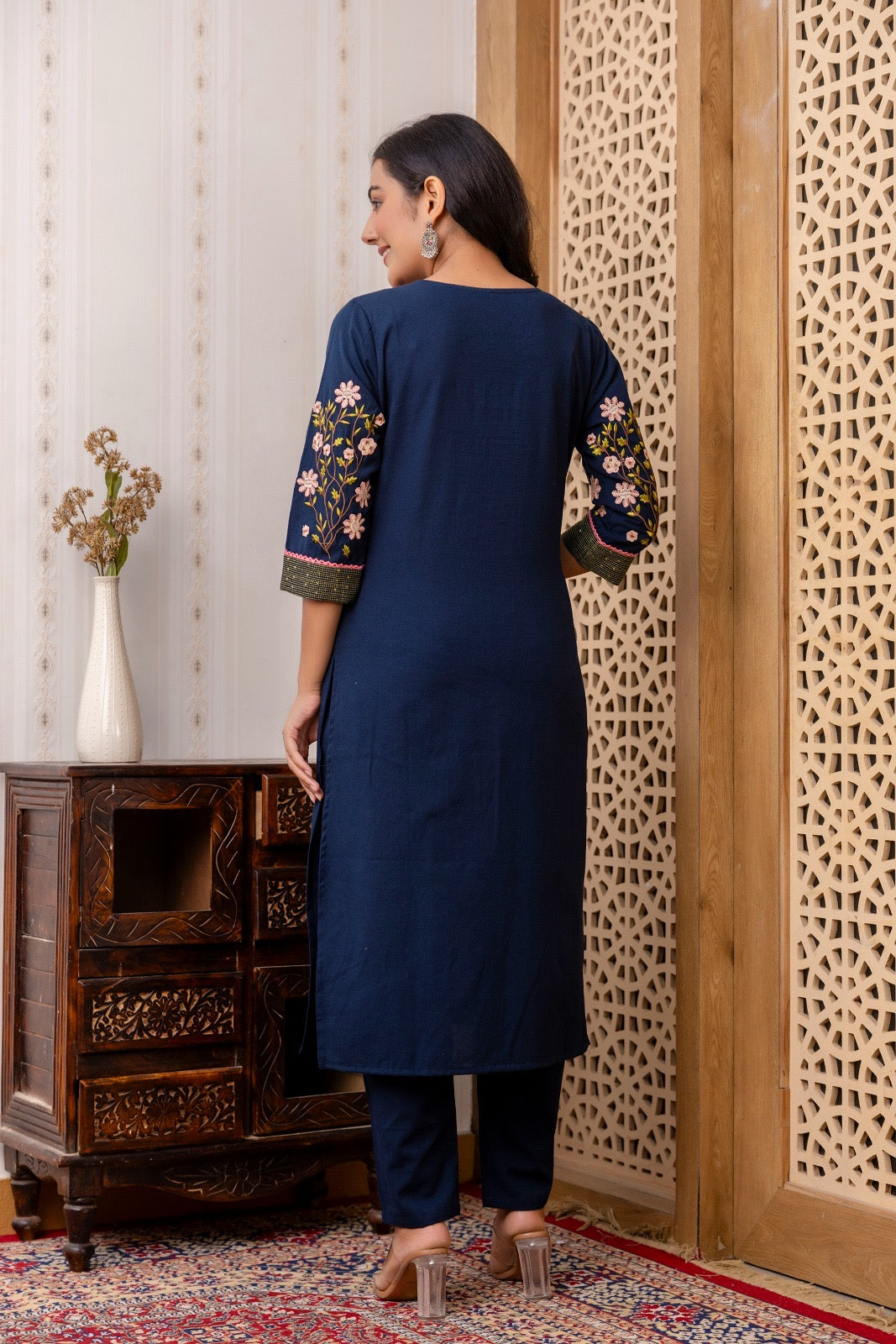 • Features intricate floral embroidery on the 3/4th sleeves, adding an elegant touch.