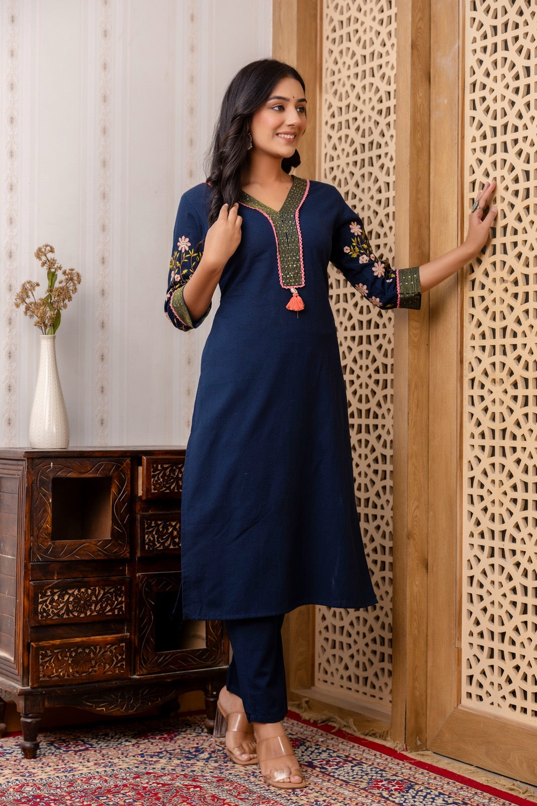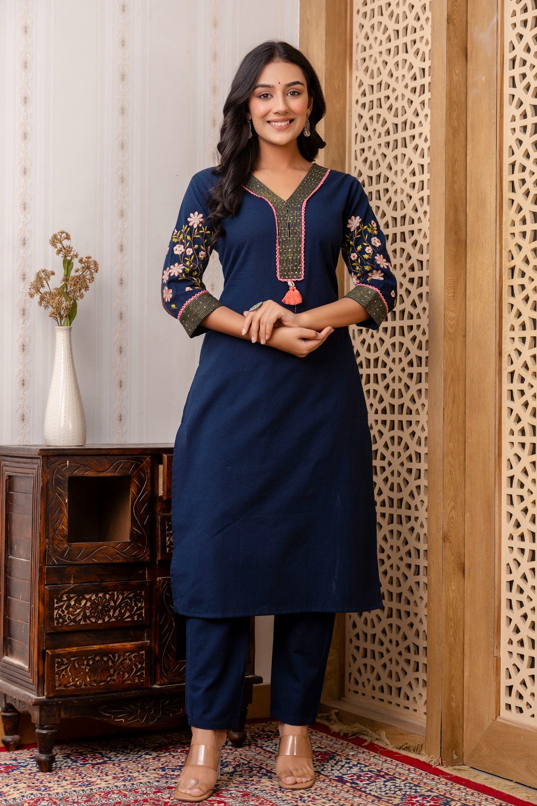 • Navy blue straight-cut cotton kurti with matching pants.