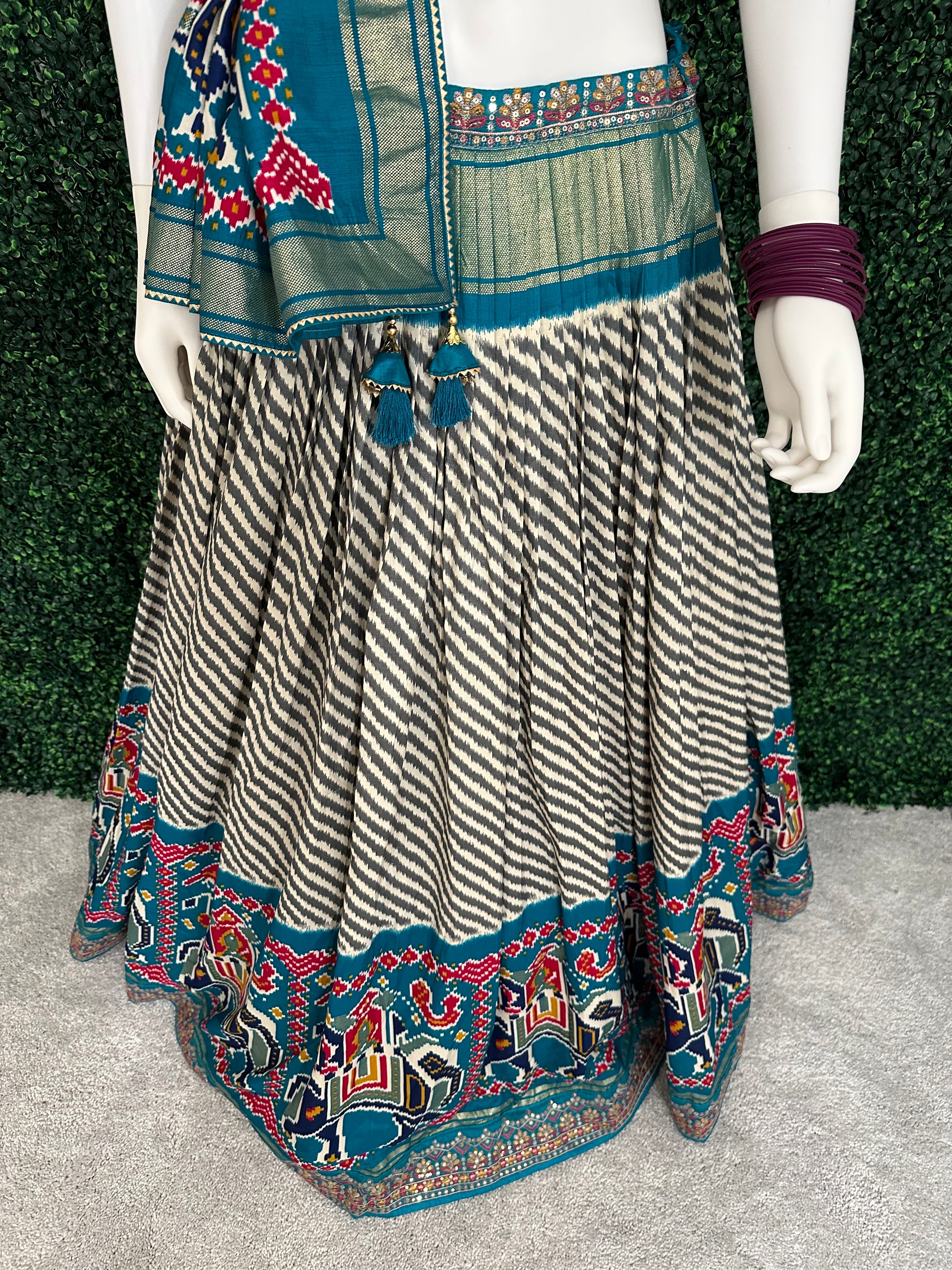 • Intricate Embroidery and Mirror Work: Adorned with detailed embroidery and mirror work, this chaniya choli reflects light beautifully, making you stand out in any festive gathering.